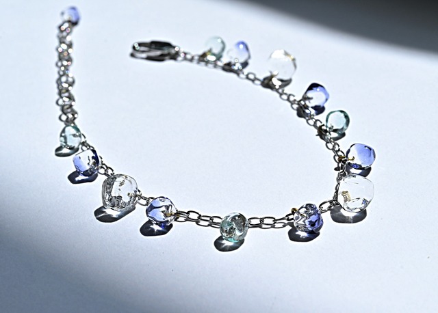ひとつひとつバーナーで溶かした小さな硝子粒を 手元が輝くように繋げました ひんやりと透明感あるパープルとクリア アクセントに小さな淡い水色を添えて ◆素材…ステンレス ◆サイズ…金具含めた全長 約20cm、アジャスター部分4cm 着用サイズ最小約15.5cm、最大約19cm アジャスター部分の調整…プラスマイナス1cm無料 ・お客様の端末環境により色合いが実際と異なる場合がございます。 ・商品に欠陥がある場合を除き、基本的に返品には応じかねます。 ・梱包に留意しておりますが、輸送時に破損などのおそれもございますので、到着後は早めのご確認をお願いします。