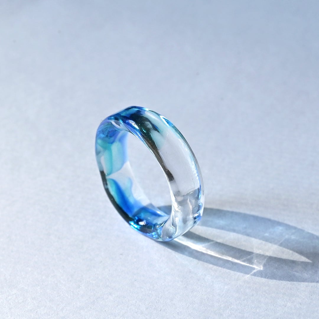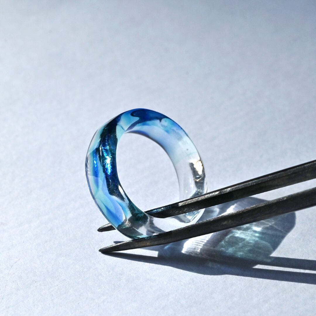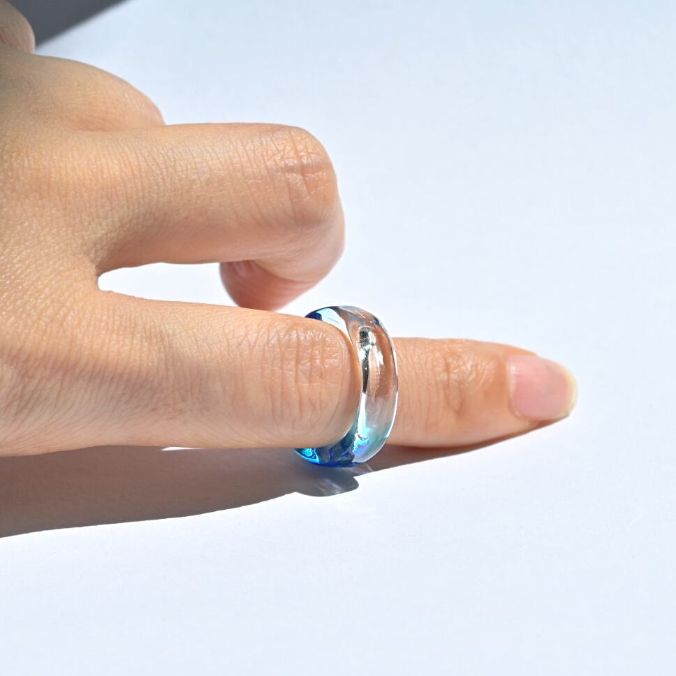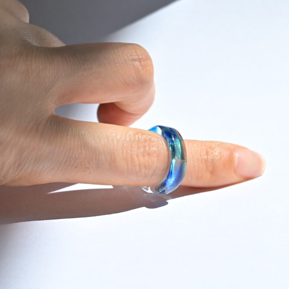 幅のあるリングですが、内側はすべりが良いので「細身の指輪」と同じ号数でのご検討が良いと思います。