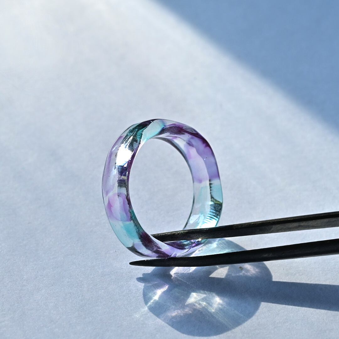 幅のあるリングですが、内側はすべりが良いので「細身の指輪」と同じ号数でのご検討が良いと思います。
