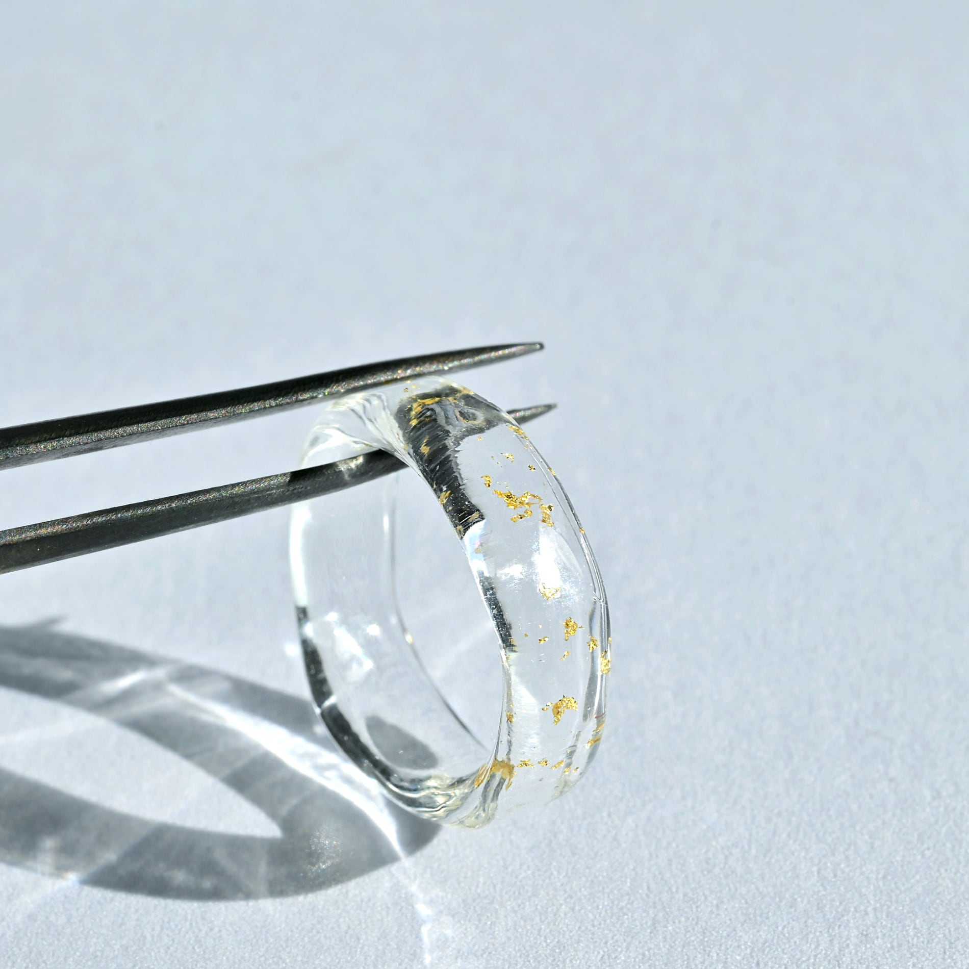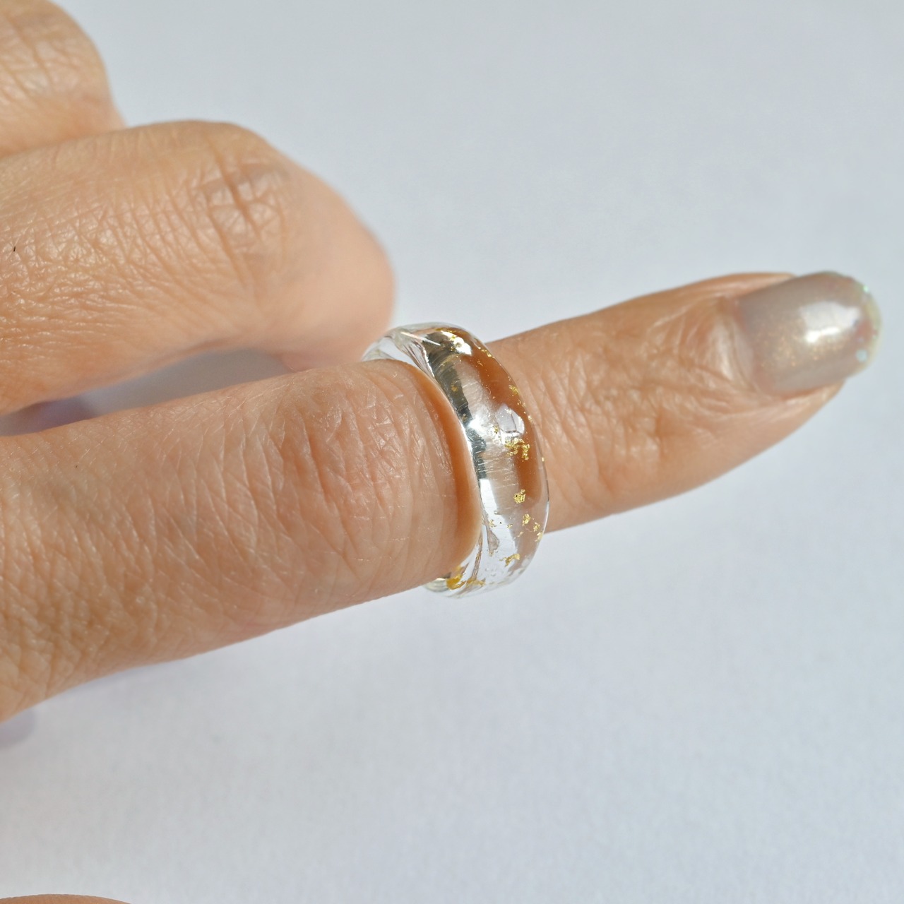 幅のあるリングですが、内側はすべりが良いので「細身の指輪」と同じ号数でのご検討が良いと思います。
